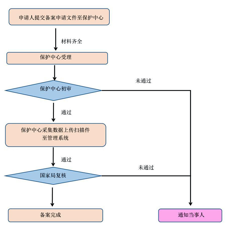 1.保护中心对申请材料进行审查,并定期公布备案结果;